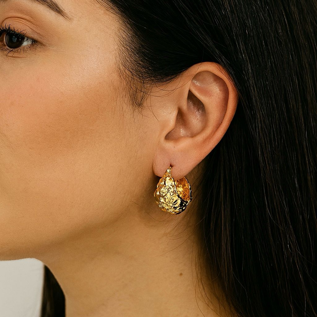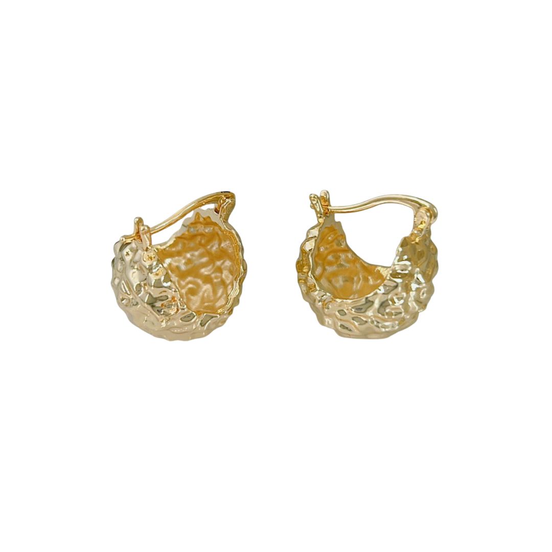 Inspirados en las formas orgánicas y las técnicas artesanales, los aretes Zama evocan pequeñas canastas de oro martillado.