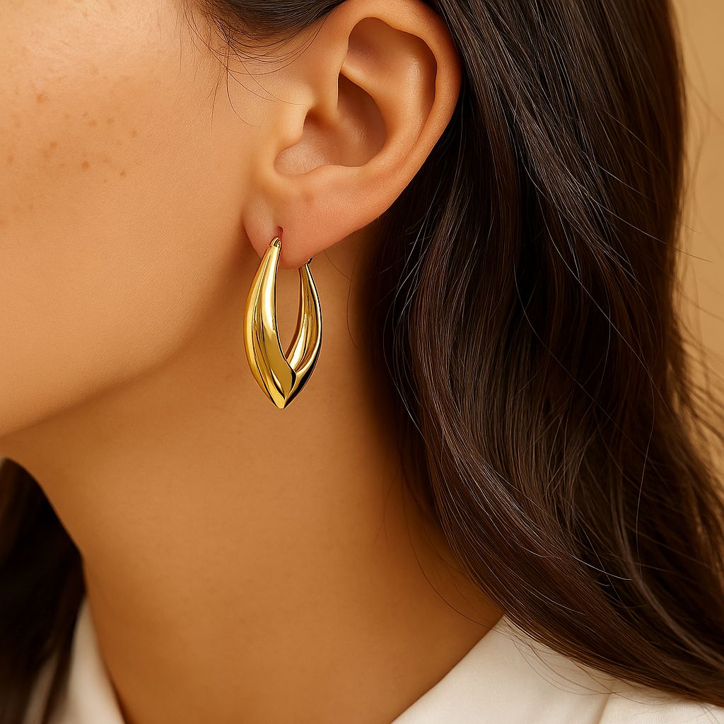 Aretes Aluna, una pieza inspirada en la fuerza suave de lo femenino. Su silueta curva y envolvente recuerda a una gota de luz suspendida, perfecta para quienes buscan un estilo sofisticado pero con carácter.