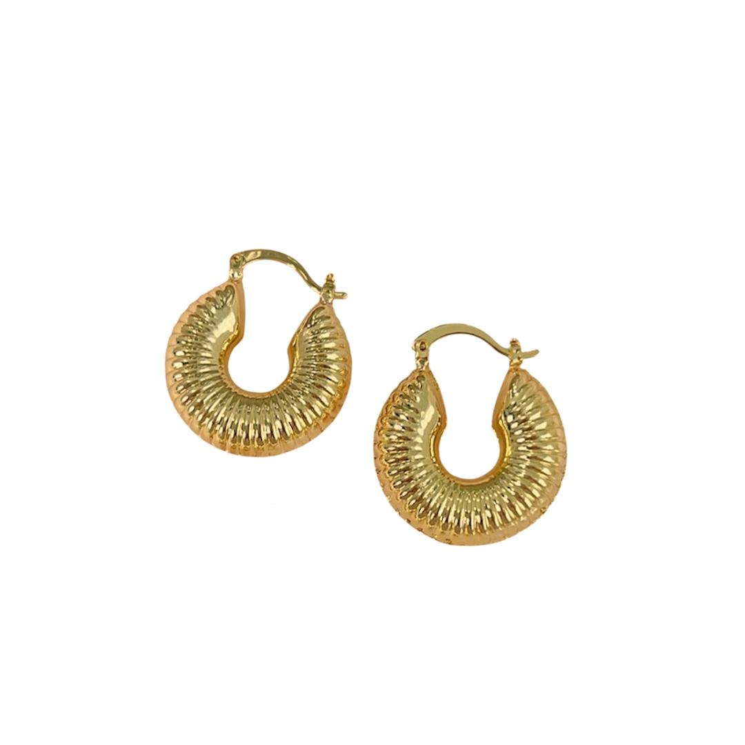 Nuestras hermosas candongas Cairo, combinan un acabado dorado brillante y textura acanalada que atrapa la luz con cada movimiento. Su forma compacta y audaz los convierte en el toque perfecto para elevar looks minimalistas o contrastar con estilos más orgánicos.