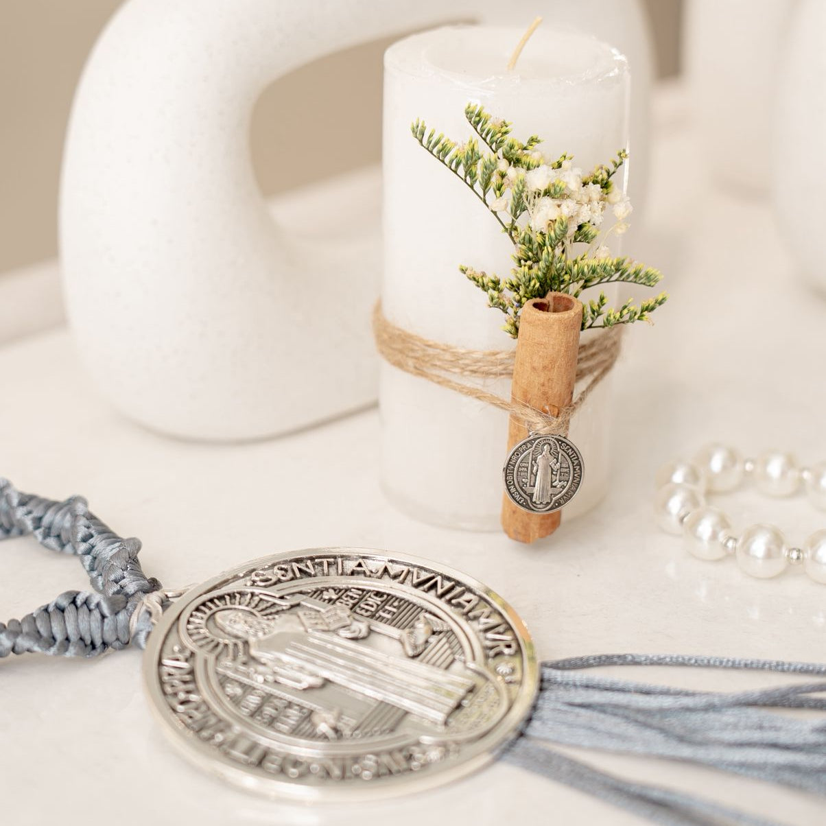 Hecha a mano y decorada con canela, flores naturales, y una medalla de San Benito. Representa la luz que disipa la oscuridad y renueva el alma.