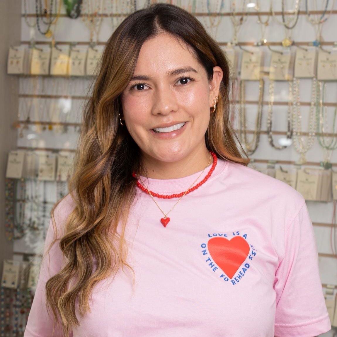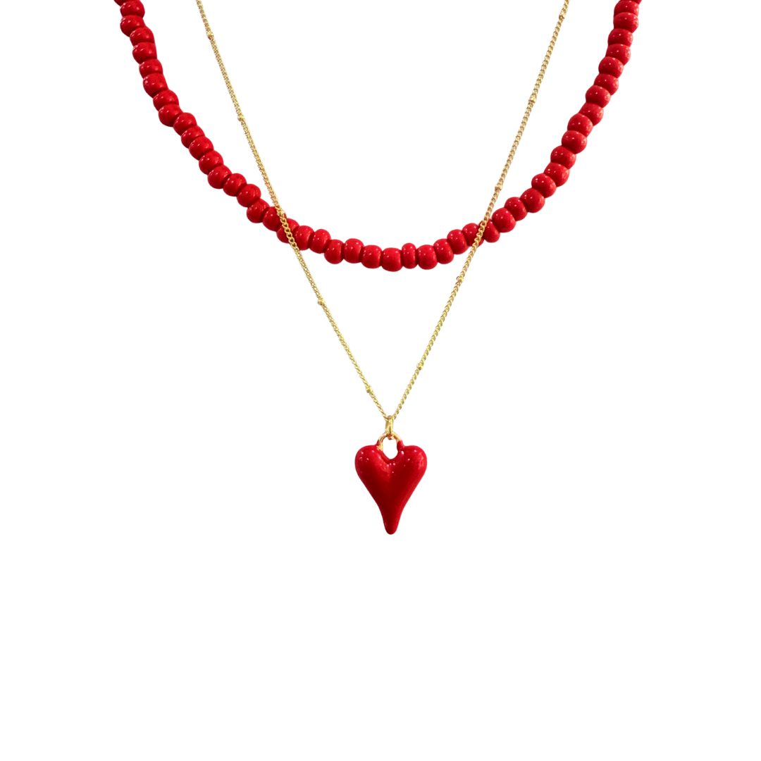 Este encantador set incluye un collar con cuentas rojas y cadena dorada, acompañado de un dije de corazón rojo brillante que roba miradas. Los aretes tipo bolita en tono dorado completan este look lleno de carácter y ternura.