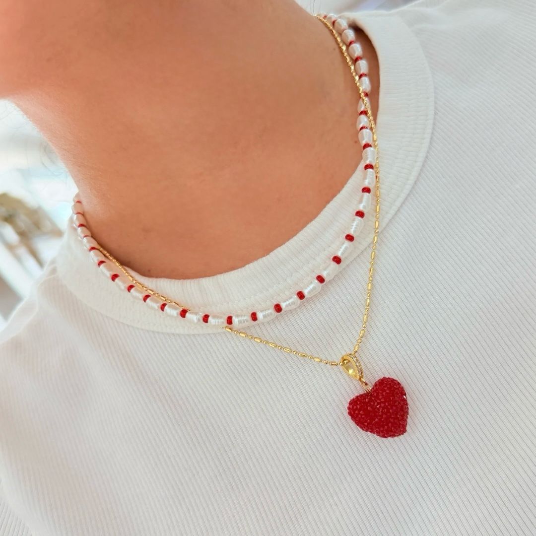 Collar en layering con gargantilla de cuentas hecho a mano y cadena dorada en rodio con corazón rojo texturizado. Juvenil, fresco y lleno de amor.