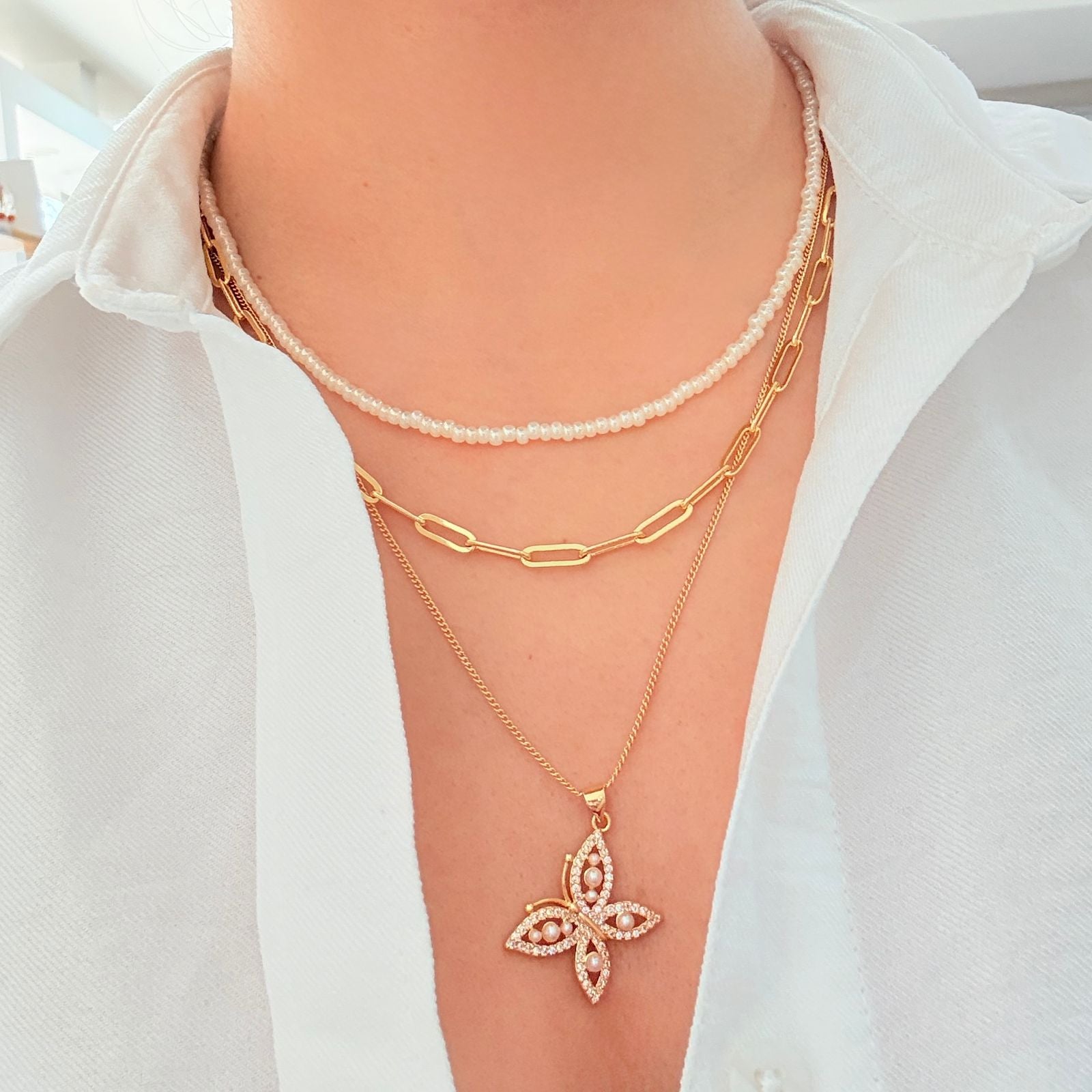 - Cadenas en rodio, dije de Mariposa en rodio, circones y mini perlas.